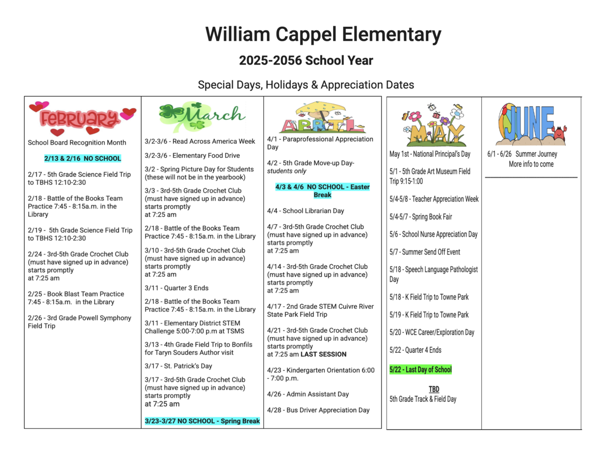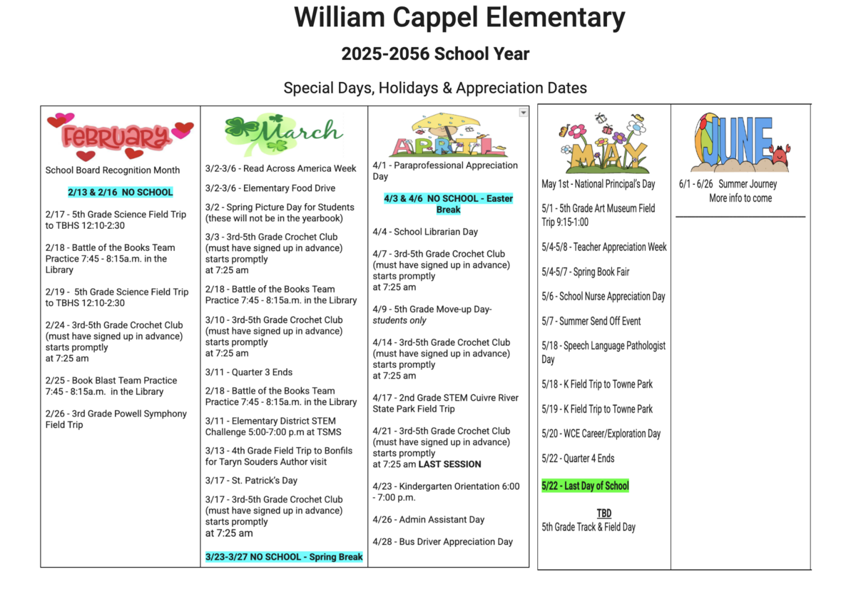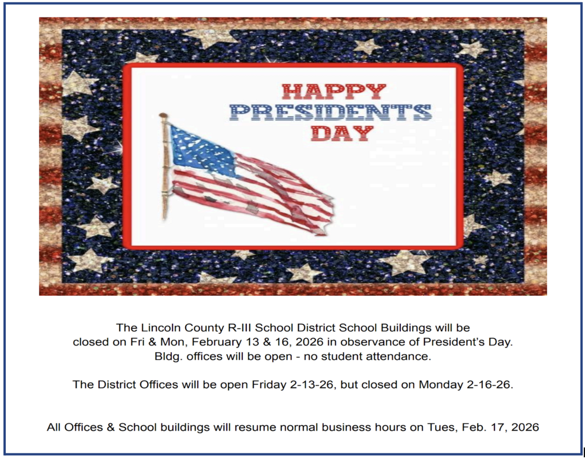 Please see this as a reminder that there is NO SCHOOL for students Friday, February 13th and Monday, February 16th in observance of President's Day. We hope everyone enjoys their four day weekend. ...