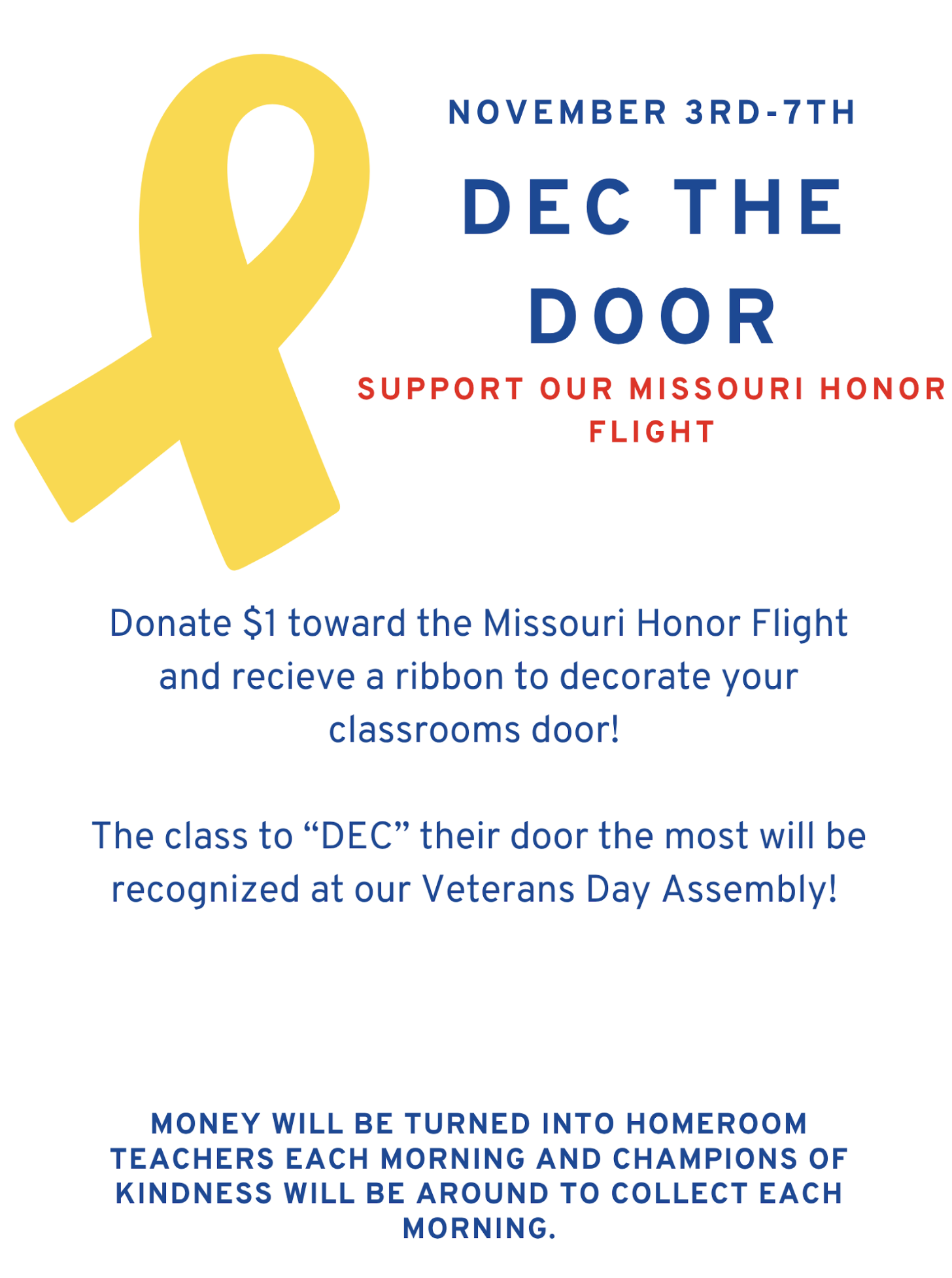 week of November 3rd-7th. Every $1.00 donated will help the Missouri Honor Flight raise funds for veterans to be able to participate in the Honor Flight event. The class to "DEC" their door the most will be recognized at our Veterans Day Assembly on November 11th. More information regarding this is noted on the flyer below.